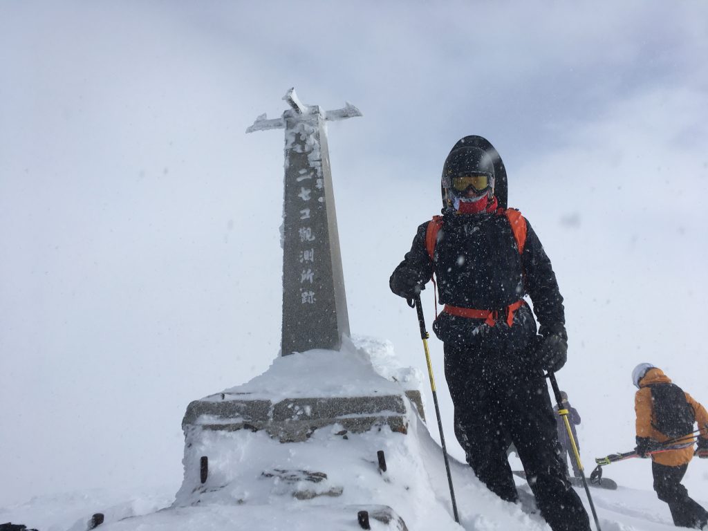 Toen de liften open gingen we uiteindelijk gelijk helemaal naar boven. Vanaf daar moesten we nog 25 minuten lopen naar de top. Board op de rug en lopen maar. Het was koud, guur en het sneeuwde enorm hard. Het zicht was daarom ook niet heel goed. Maarja, gewoon de gids volgen.